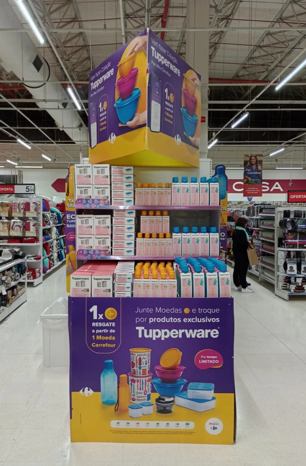 Trazer a paleta vibrante dos produtos Tupperware integrada com a identidade Carrefour + Minhas Recompensas, utilizando de formas fluídas para compor a faca do PDV, chamando atenção aos elementos.
